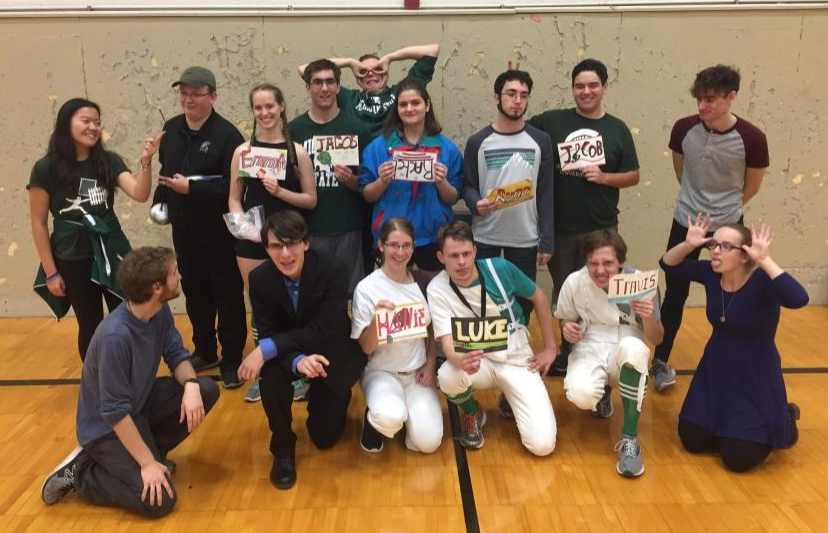 Newbie Tournament 2019 by Webmaster | Aug 30, 2020 | media gallery Epee team picture. Newbie epee bouts. MSU Fencers (Travis, Ryan, Luke, Jacob, Jacob) warming up together. Epee finalists (Luke, Travis) Saber finalists (Jacob, Andrew) Saber looking over their score sheet. Saber pretending to talk in front of a camera. Watching the newbie fencing bouts.